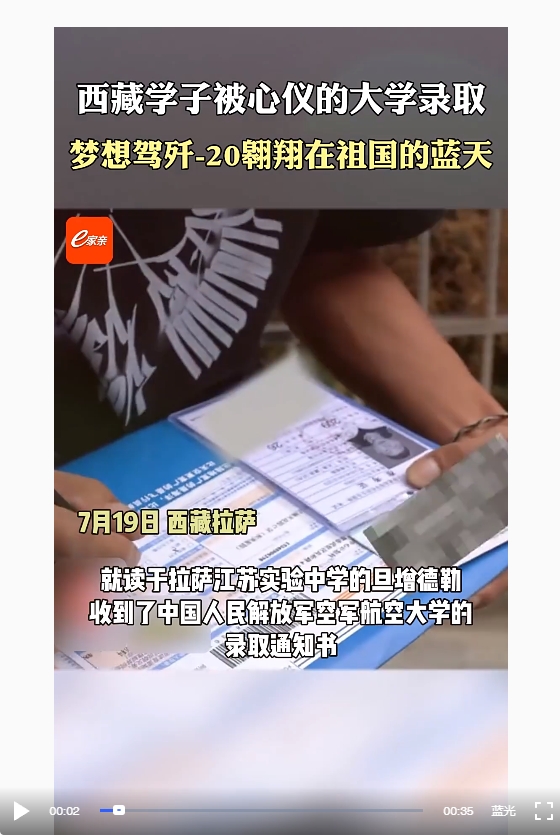 7月19日,就讀于拉薩江蘇實(shí)驗(yàn)中學(xué)的旦增德勒收到了中國(guó)人民解放軍空軍航空大學(xué)的錄取通知書(shū),他是今年全區(qū)唯一一個(gè)被該大學(xué)錄取的藏族學(xué)子。旦增德勒表示,他的夢(mèng)想是開(kāi)著殲-20在祖國(guó)的天空上翱翔。