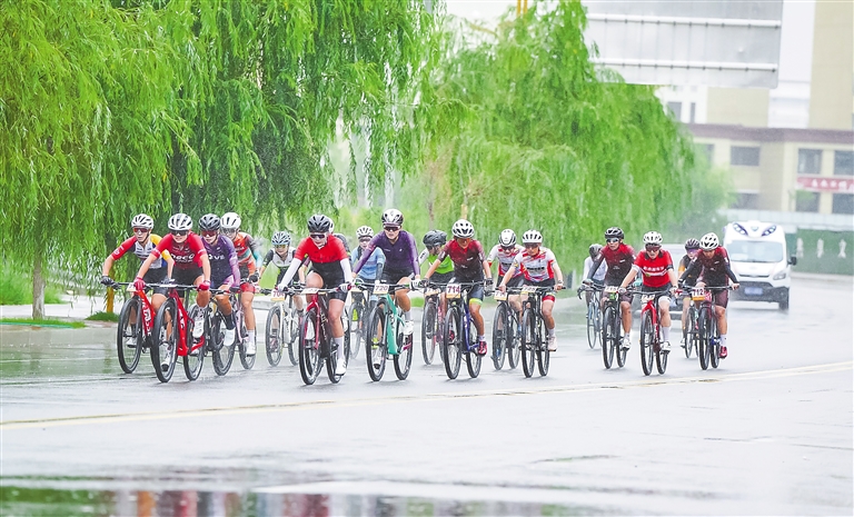 堆龍德慶站比賽中,選手冒雨騎行。