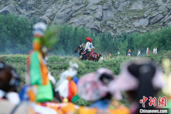 7月24日,西藏拉薩市曲水縣南木村迎來(lái)了一年一度的“望果節(jié)”。當(dāng)日,村民們盛裝打扮背上經(jīng)文,圍繞全村田園轉(zhuǎn)上一圈,轉(zhuǎn)到每一塊農(nóng)田前都要煨桑祈求風(fēng)調(diào)雨順、五谷豐登?!巴?jié)”民俗已有1500多年的歷史,是國(guó)家級(jí)非物質(zhì)文化遺產(chǎn)。圖為曲水縣南木村村民身著盛裝騎馬繞田。中新社記者 貢嘎來(lái)松 攝