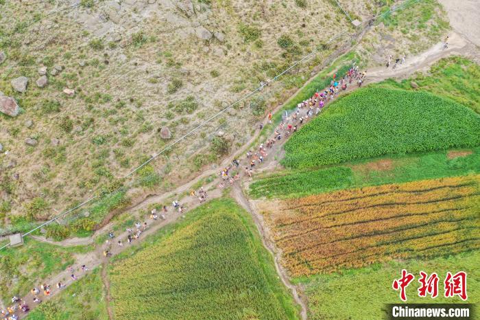 7月24日,西藏拉薩市曲水縣南木村迎來(lái)了一年一度的“望果節(jié)”。當(dāng)日,村民們盛裝打扮背上經(jīng)文,圍繞全村田園轉(zhuǎn)上一圈,轉(zhuǎn)到每一塊農(nóng)田前都要煨桑祈求風(fēng)調(diào)雨順、五谷豐登?!巴?jié)”民俗已有1500多年的歷史,是國(guó)家級(jí)非物質(zhì)文化遺產(chǎn)。圖為曲水縣南木村村民身著盛裝背上經(jīng)文繞田。(無(wú)人機(jī)照片)中新社記者 貢嘎來(lái)松 攝