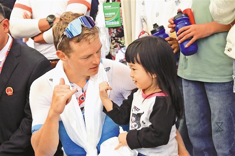 第一賽段第一名、來自飛銳蒙古洲際隊(duì)的LAAS Martin和當(dāng)?shù)睾⒆踊?dòng)。記者 洛桑平措 謝筱純 王珊 攝