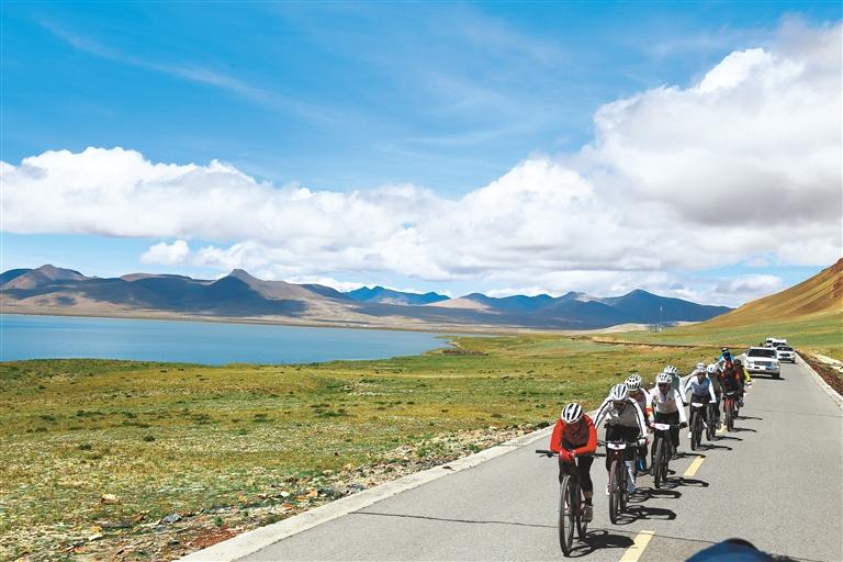 圖為參賽選手騎行在普莫雍措湖畔。本報記者 潘璐 攝