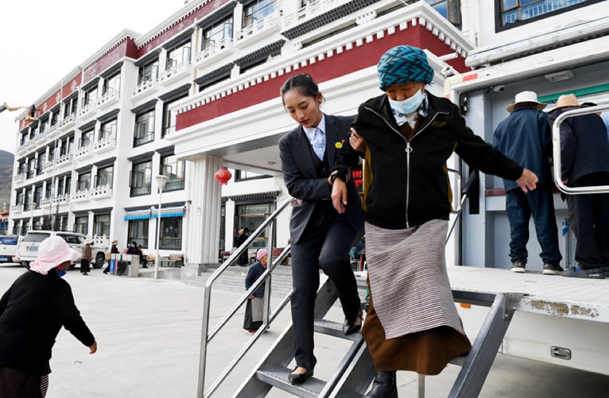 圖為農(nóng)行山南乃東支行客戶經(jīng)理娜姆措(左一)攙扶老人走下流動(dòng)金融服務(wù)車。旦增蘭澤攝
