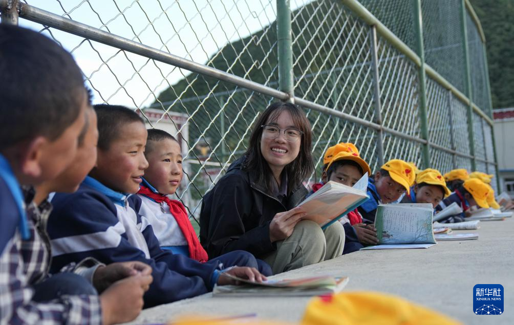 在娘蒲鄉(xiāng)中心小學(xué),娘蒲鄉(xiāng)中心小學(xué)藏文老師格桑曲珍在上藏文課(9月3日攝)。格桑曲珍曾經(jīng)也是該校學(xué)生。新華社記者 丁增尼達(dá) 攝