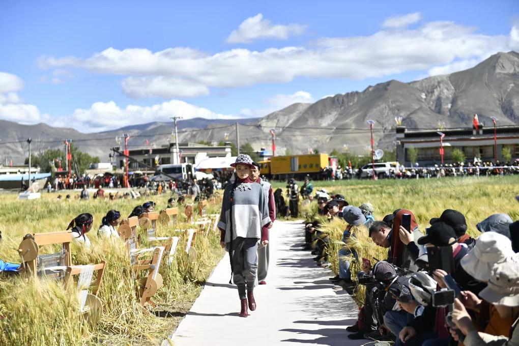 田野間,新開(kāi)辟出的一條上百米的S形秀道婉轉(zhuǎn)綿延。隨著富有節(jié)奏感的音樂(lè)響起,身著氆氌藏族服飾的模特款款走來(lái),一旁,30位藏族“阿佳”坐在編織機(jī)前熟練地捻織著氆氌手工品。
