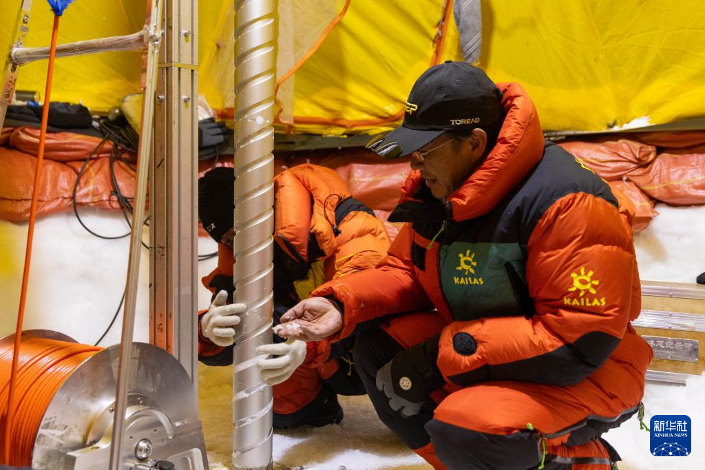 徐柏青(右二)和同事從鉆頭中取出鉆取的冰芯(9月11日攝)。新華社記者 姜帆 攝