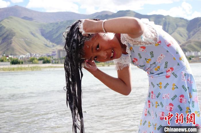 不少兒童在大人的看護(hù)下嬉戲玩水,9歲的強(qiáng)久措姆說(shuō):“我覺(jué)得在河邊洗澡特別有趣,能夠更好地親近大自然,還可以過(guò)林卡?!?/p>