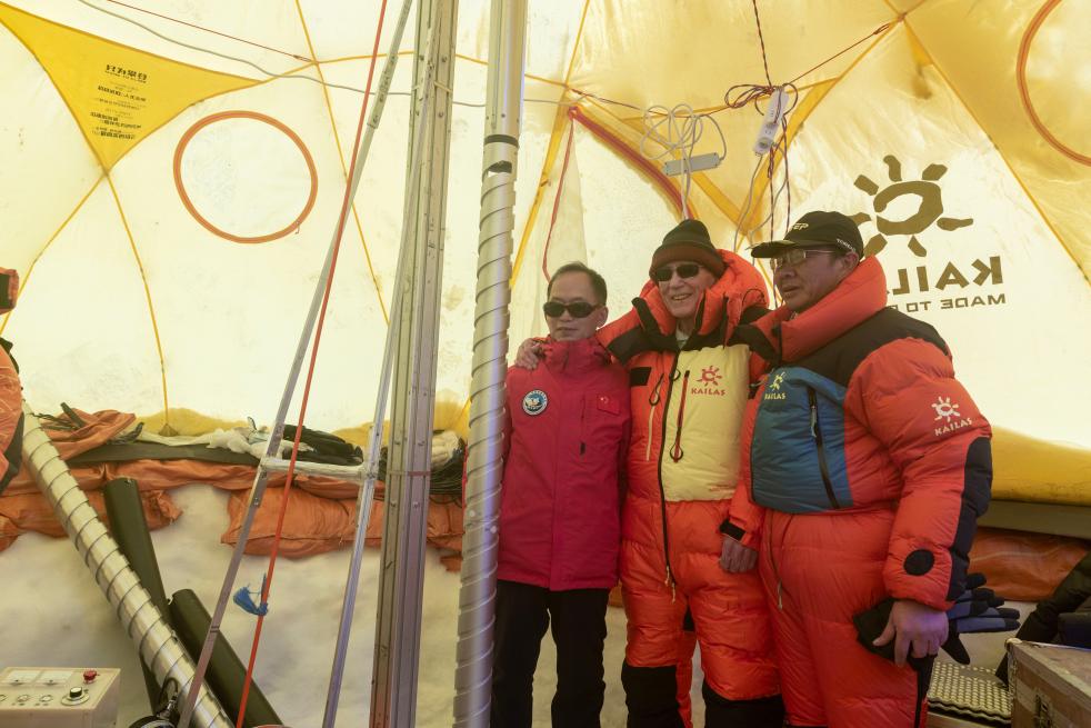 姚檀棟(左一)、湯普森(左二)在普若崗日冰原10號(hào)冰川冰穹C作業(yè)點(diǎn)工作帳篷內(nèi)與冰芯鉆取工作負(fù)責(zé)人徐柏青研究員合影。新華社記者姜帆 攝