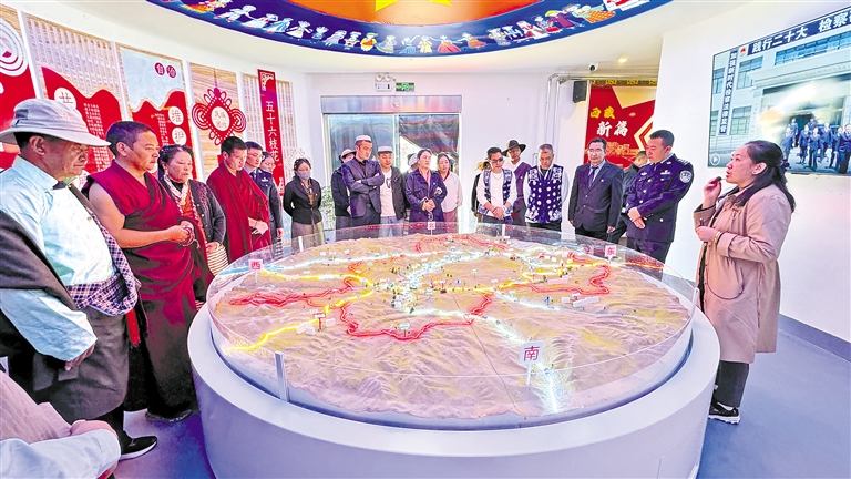 9月14日,拉孜縣曲下鎮(zhèn)以鑄牢中華民族共同體意識(shí)為主線,舉辦首屆“格?;ㄩ_石榴紅·凝心鑄魂新征程”運(yùn)動(dòng)會(huì)暨“迎中秋、慶團(tuán)結(jié)”茶話會(huì)。 圖為各民族群眾代表參觀拉孜縣鑄牢中華民族共同體意識(shí)教育館。