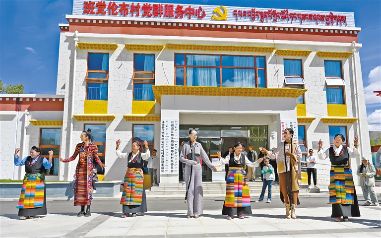 圖為9月,在日喀則市江孜縣江熱鄉(xiāng)班覺倫布村舉辦的西藏氆氌系列發(fā)布秀結(jié)束后,群眾齊跳鍋莊,跳出民族團(tuán)結(jié)“同心圓”。
