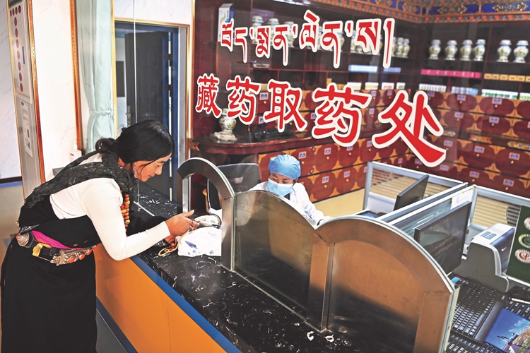 甘肅甘南州,碌曲縣藏醫(yī)院,民眾在藏藥取藥處取藥