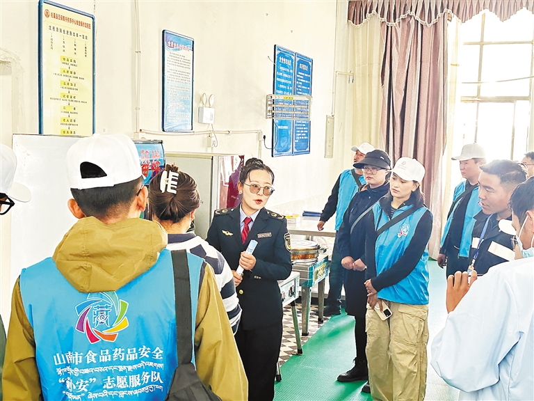 山南市市場(chǎng)監(jiān)管執(zhí)法人員向食品藥品安全志愿服務(wù)隊(duì)講解食品安全檢查相關(guān)內(nèi)容。記者 巴桑旺姆 攝