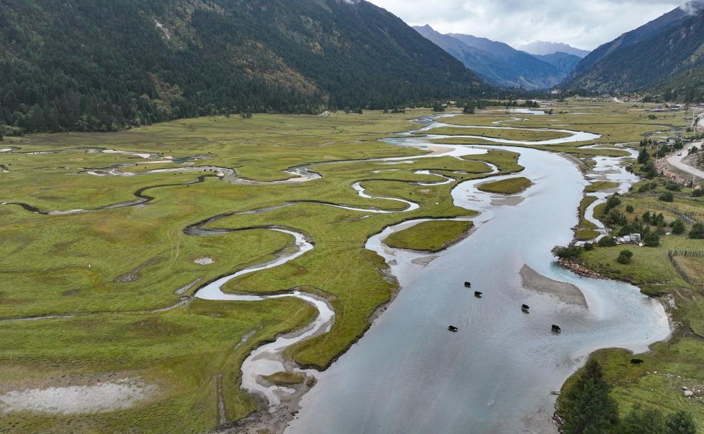 10月4日,在林芝工布江達(dá)縣,一隊(duì)牦牛涉水通過(guò)河流(無(wú)人機(jī)照片)。新華社記者 晉美多吉 攝