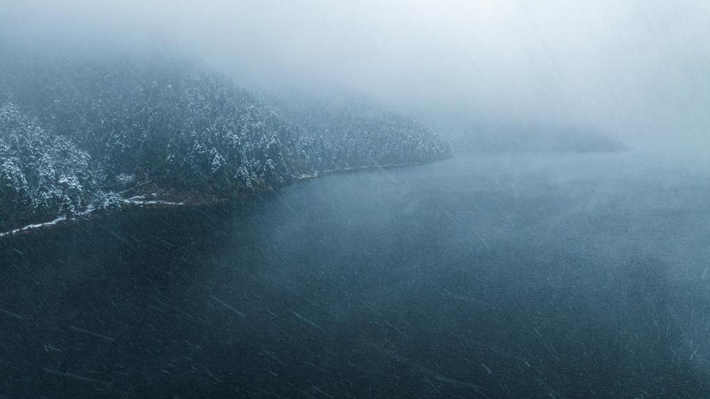 風(fēng)雪中的措木及日景區(qū)(無(wú)人機(jī)照片,10月20日攝)。措木及日位于西藏林芝市八一鎮(zhèn)市郊,是一座古冰磧湖。新華社記者 丁增尼達(dá) 攝