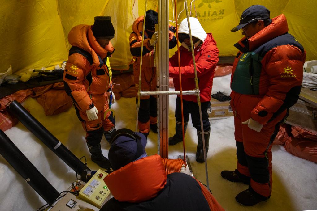 連日來,徐柏青帶領著團隊在海拔6100多米的冰原頂部安營扎寨、頂風冒雪,最終以324米的長度打破世界紀錄,成為全球中低緯度冰川最長冰芯。