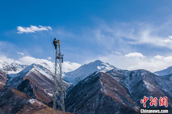 資料圖為2023年11月30日,西藏索縣一條35千伏線路工程施工人員正在開(kāi)展塔上作業(yè)。趙清鵬 攝