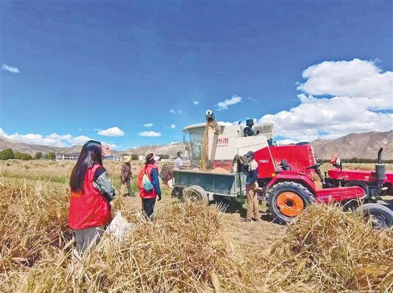 拉孜縣的志愿者在田間地頭服務秋收工作。拉孜縣融媒體中心提供
