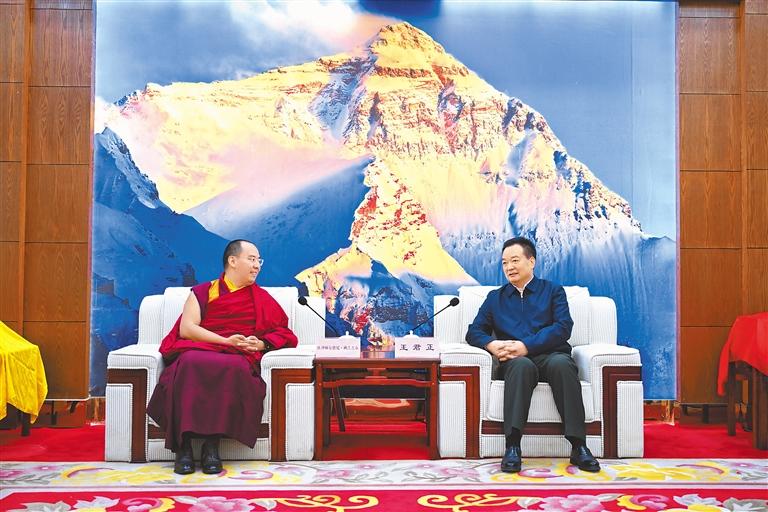 調(diào)研結(jié)束后,王君正在日喀則市會見了班禪額爾德尼·確吉杰布,對其在藏各項活動的順利開展、圓滿成功表示祝賀。王君正指出,班禪額爾德尼·確吉杰布回藏履職以來,深入貫徹習近平總書記關(guān)于宗教工作、西藏工作的重要指示和新時代黨的治藏方略,深入學(xué)習宣傳“三個意識”,廣泛接觸基層干部群眾和寺廟僧尼,積極宣傳黨的民族宗教政策,在推進藏傳佛教中國化、鑄牢中華民族共同體意識、引導(dǎo)信眾投身社會主義現(xiàn)代化新西藏建設(shè)等方面做了積極有效的工作。希望班禪額爾德尼·確吉杰布進一步學(xué)習領(lǐng)會習近平總書記重要指示精神,堅定不移維護祖國統(tǒng)一、加強民族團結(jié),全力維護社會和諧穩(wěn)定的良好局面;堅定不移推進藏傳佛教中國化,對教規(guī)教義作出通俗易懂、與時俱進的闡釋;堅定不移深化拓展“國家意識、公民意識、法治意識”教育,把各方面力量凝聚起來,奮力推進社會主義現(xiàn)代化新西藏建設(shè)。