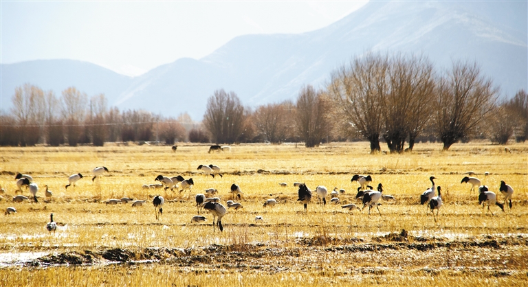 位于雅魯藏布江與年楚河交匯處的日喀則市桑珠孜區(qū)邊雄鄉(xiāng),是黑頸鶴的越冬地之一。這里有廣袤的農田和濕地,黑頸鶴可在此覓食、過冬。