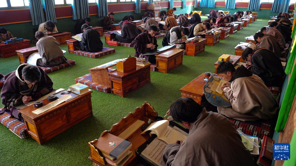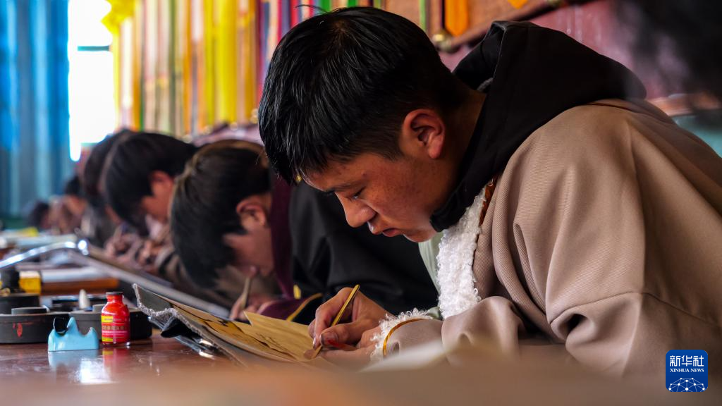 11月22日,昌都市丁青縣擁忠文化藝術(shù)中心非遺扶貧就業(yè)工坊學(xué)員在練習藏文書法。新華社記者 普布次仁 攝