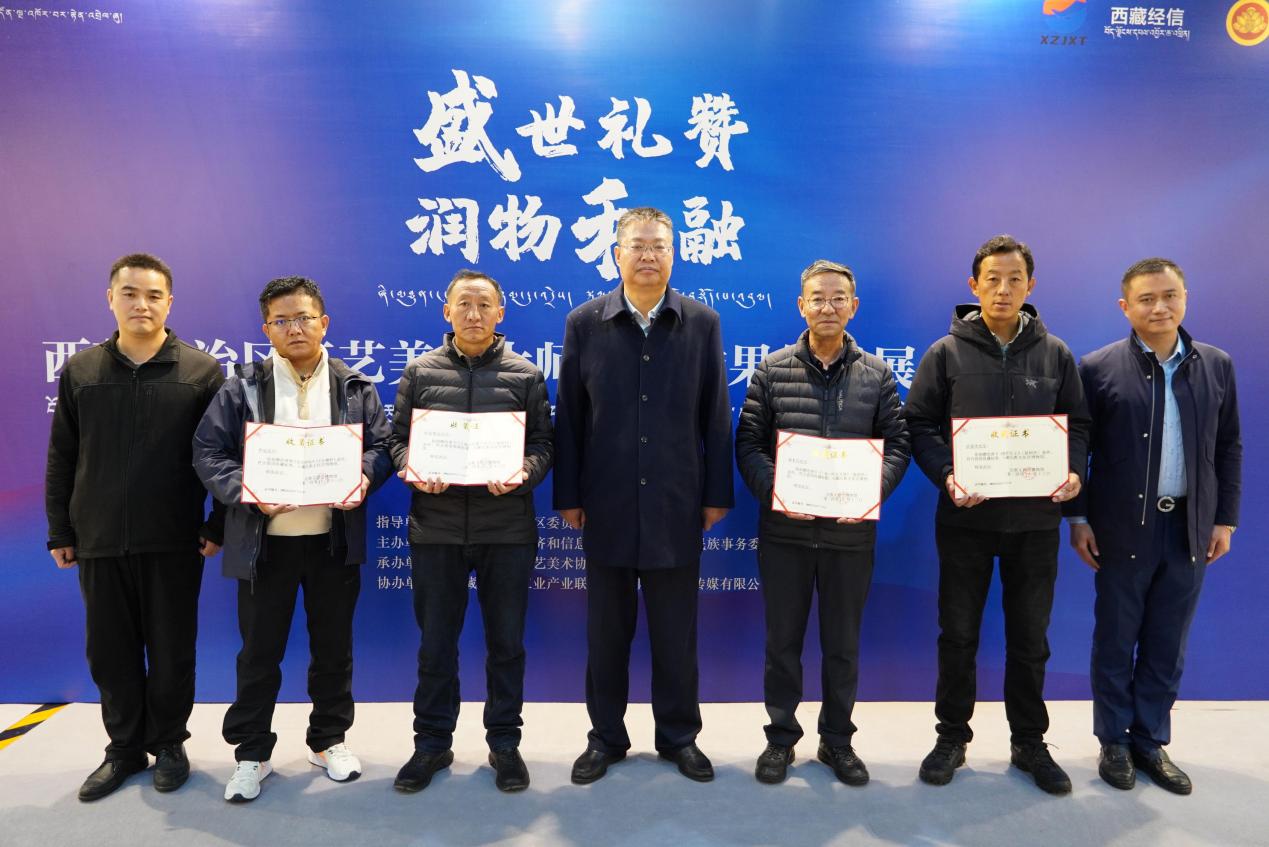 “西藏自治區(qū)工藝美術(shù)大師評選成果作品展”由西藏自治區(qū)經(jīng)濟和信息化廳、西藏自治區(qū)民族事務(wù)委員會聯(lián)合主辦,于2024年11月7日在民族文化宮展出。本次捐贈作品為“西藏自治區(qū)工藝美術(shù)大師評選成果作品展”中的5件代表性精品力作,包括唐卡作品《格薩爾王》(復(fù)制件)(作者:貢覺杰)、《文成公主建小昭寺》(復(fù)制件)(作者:羅布斯達)、《一枝一葉總關(guān)情》(復(fù)制件)(作者:珠木巧),堆繡作品《金絲野牦牛》(作者:晉美洛追)、《石榴籽》(作者:晉美洛追)。任毅同志向作者頒發(fā)了收藏證書,并表示誠摯感謝。