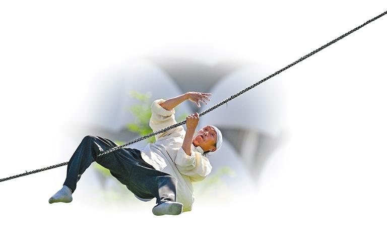 第十二屆全國少數(shù)民族傳統(tǒng)體育運動會,西藏隊選手表演《強桿踏許》。