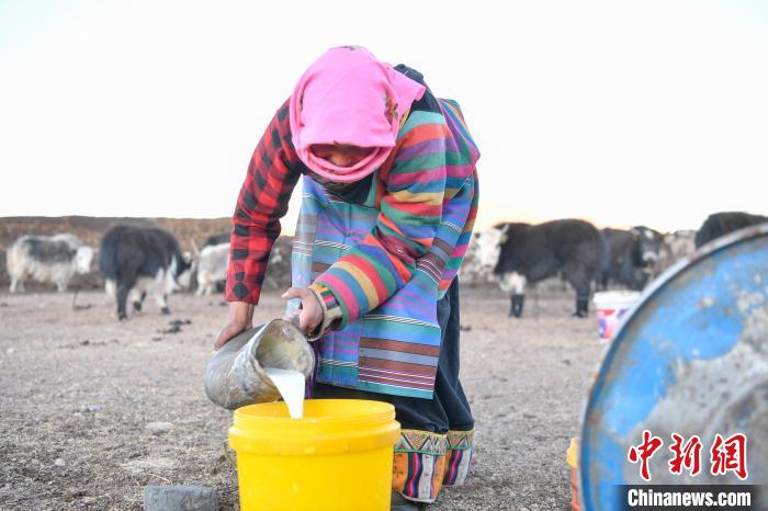 12月12日,西藏自治區(qū)那曲市安多縣帕那鎮(zhèn)牧民土巴卓瑪將擠好的牦牛奶倒入奶桶。中新社記者 貢嘎來松 攝