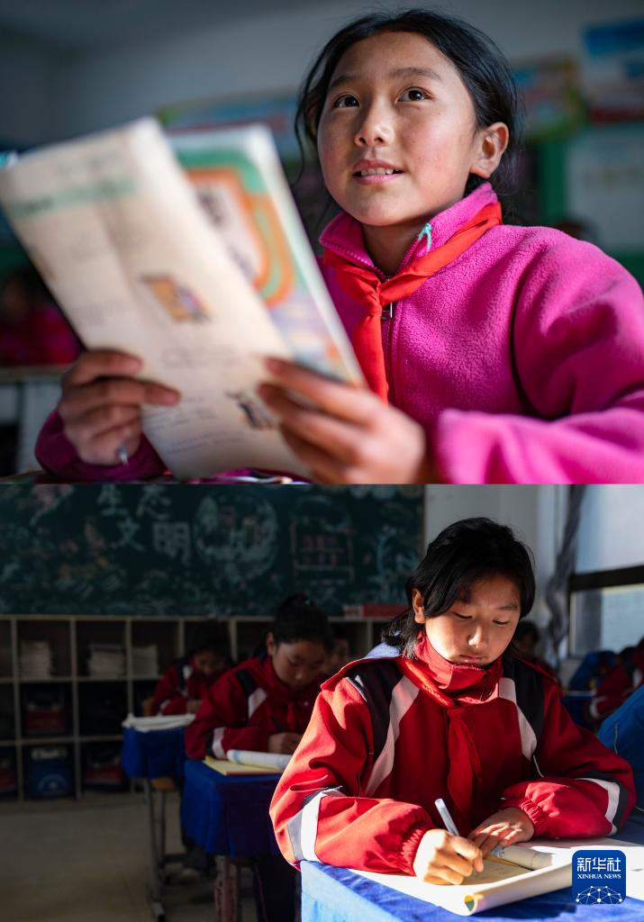拼版照片:上圖為2021年11月24日,陳塘鎮(zhèn)小學(xué)三年級(jí)(1)班夏爾巴學(xué)生旺姆在讀課文;下圖為2024年12月13日,陳塘鎮(zhèn)小學(xué)六年級(jí)(1)班夏爾巴學(xué)生旺姆在上數(shù)學(xué)課。