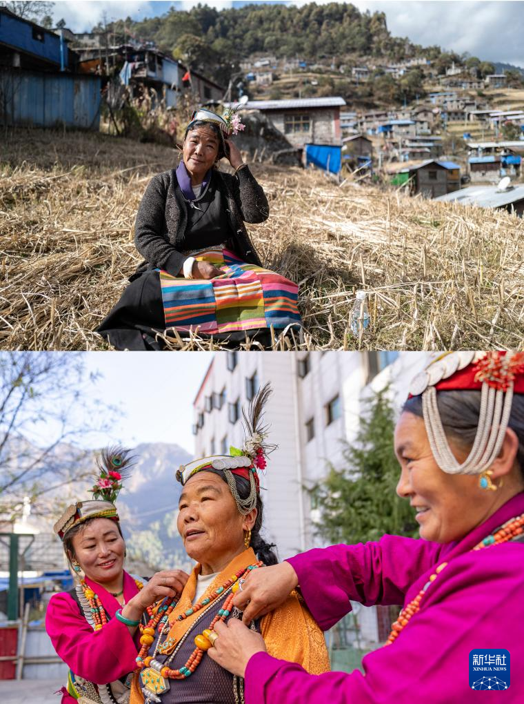 拼版照片:上圖為2021年11月27日,非遺陳塘夏爾巴歌舞代表性傳承人朗嘎在山坡上演唱時(shí)調(diào)整自己的頭飾;下圖為2024年12月13日,兩位夏爾巴婦女在為非遺陳塘夏爾巴歌舞代表性傳承人穿戴民族服飾。