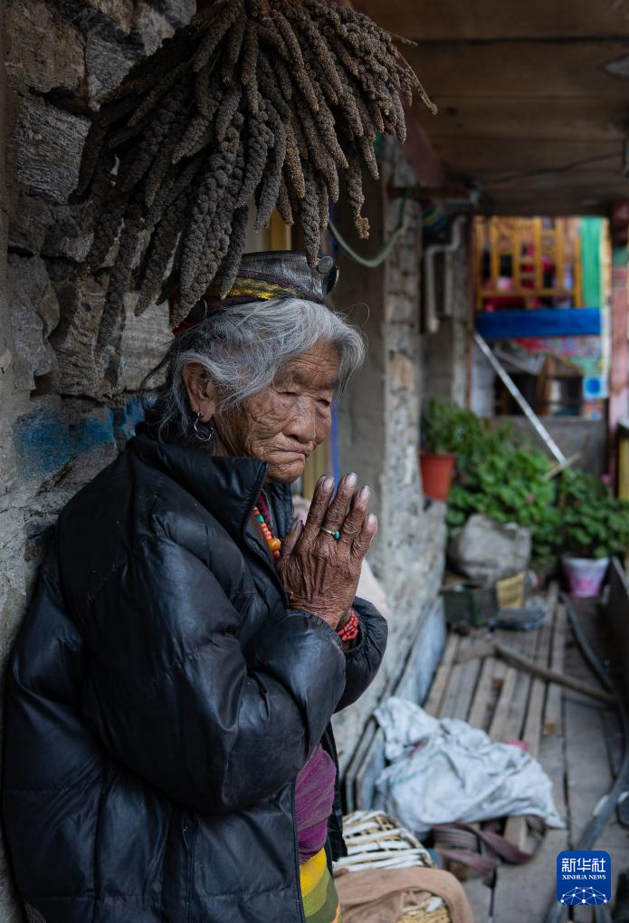 12月13日,一名陳塘鎮(zhèn)夏爾巴老人站在自家陽臺(tái)上祈福。