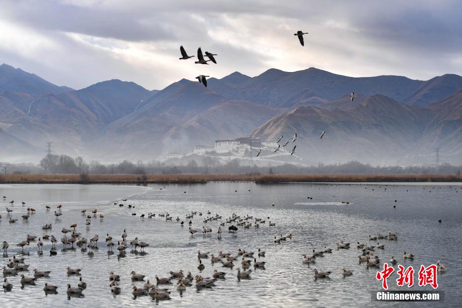 12月29日,冬日早晨,拉薩美如畫。拉薩河被晨光染成金色,河水靜靜流淌。西藏自治區(qū)拉薩市的拉魯濕地國家級自然保護區(qū)內,候鳥歡快,忙著覓食、嬉戲。遠處,布達拉宮與拉魯濕地相互映襯,構成了一幅絕美畫卷。圖為12月29日,在拉魯濕地越冬的候鳥成群結隊。貢確 攝