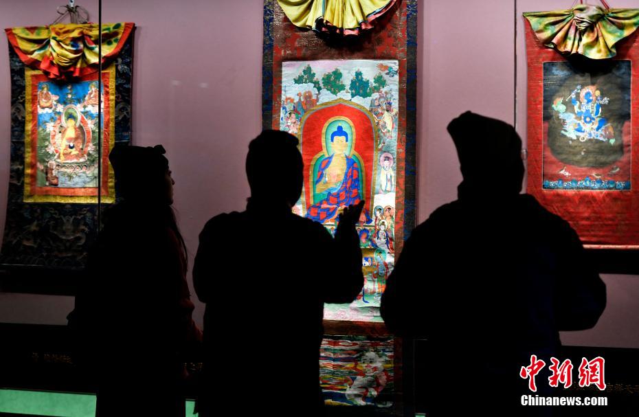 以“見證與守望——鑄牢中華民族共同體意識主題展”為主題的展覽近日亮相西藏自治區(qū)拉薩市布達(dá)拉宮珍寶館。本次主題展精選100余件文物珍品,展覽通過文物、古籍及布達(dá)拉宮的傳承與發(fā)展,講述各民族交往交流交融的故事。圖為1月2日,觀眾拍攝展覽中的唐卡。中新社記者 李林 攝
