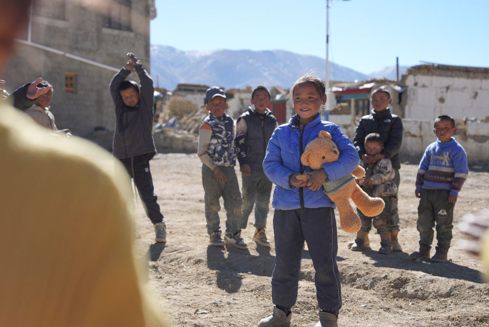 2025年1月8日,在日喀則市定日縣措果鄉(xiāng)塘仁村地震災(zāi)后安置點(diǎn),工作人員向孩子們贈(zèng)送玩偶熊,并給他們表演節(jié)目。新華社記者 晉美多吉 攝