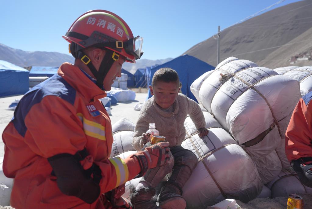 1月8日,在塘仁村安置點(diǎn),消防救援人員和小朋友互動。