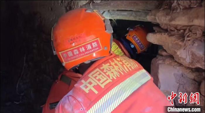 圖為日喀則市森林消防救援大隊隊員在受損房屋內搜尋受災村民財產。米瑪次仁 攝