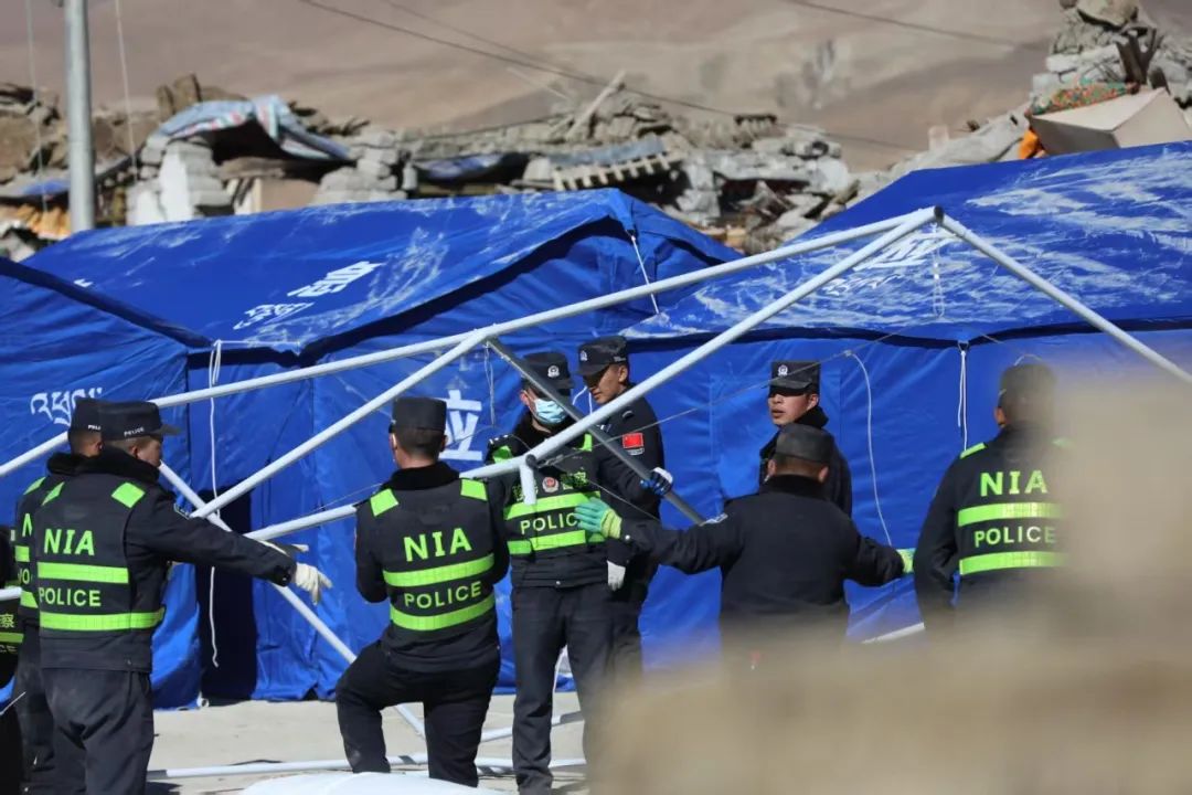 圖為日喀則邊境管理支隊民警在定日縣長所鄉(xiāng)玉白村安置點(diǎn)為群眾搭建帳篷。郭遠(yuǎn)敬 攝