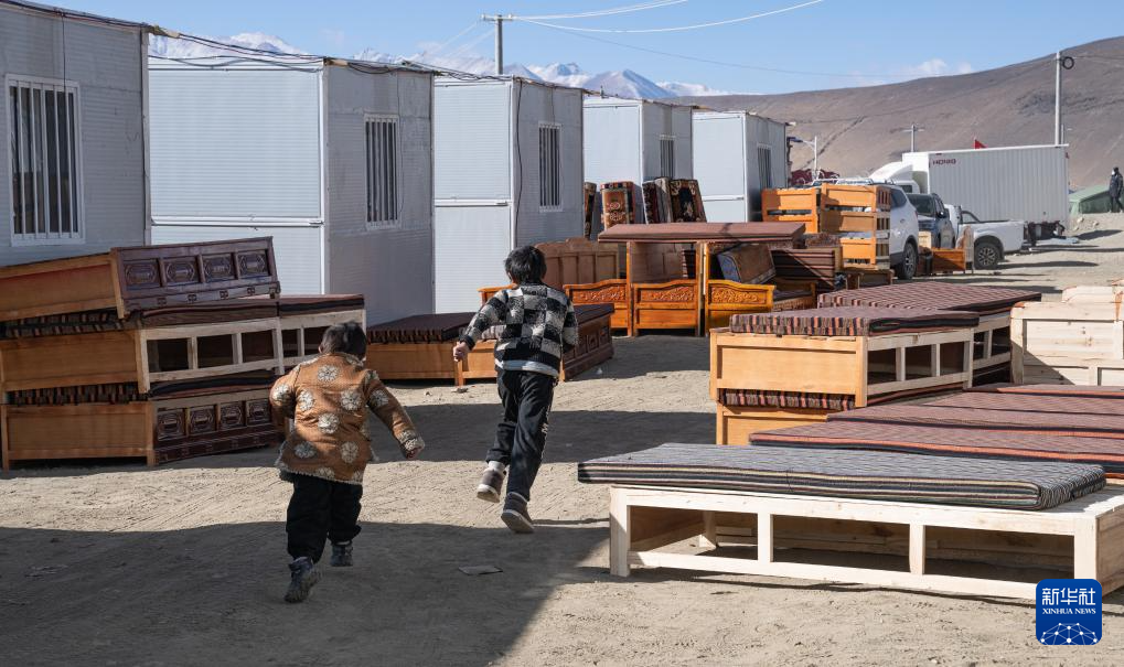 在定日縣長(zhǎng)所鄉(xiāng)嘎旦村,兩個(gè)孩子在剛運(yùn)來的兩排藏床間奔跑(1月13日攝)。新華社記者 丁增尼達(dá) 攝