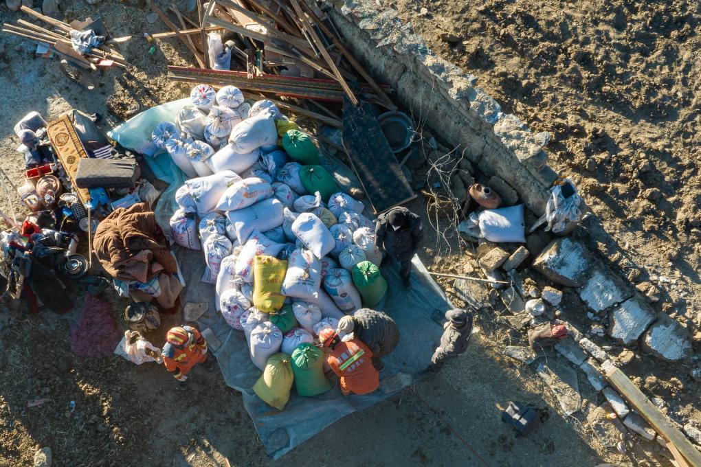 1月13日,在定日縣長所鄉(xiāng)古榮村,消防員們在整理從廢墟中搶救出的青稞(無人機照片)。新華社記者丁增尼達(dá) 攝