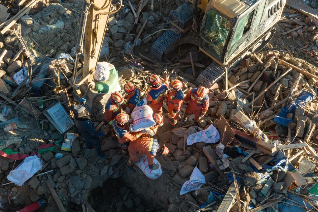 1月13日,在定日縣長所鄉(xiāng)古榮村,消防員們在搬運從廢墟中搶救出的青稞(無人機照片)。新華社記者丁增尼達(dá) 攝