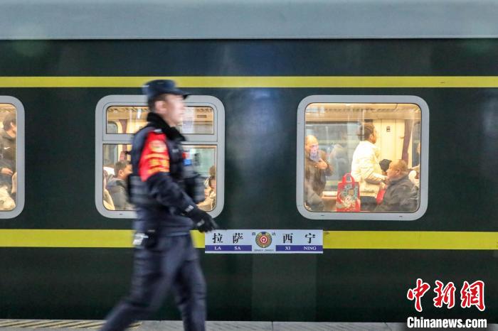 春運(yùn)首日,拉薩站派出所民警在站臺巡視。 黃飛 攝