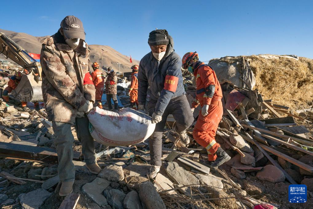 1月13日,在定日縣長所鄉(xiāng)古榮村,消防員在搬運(yùn)搶救出來的青稞。新華社記者 丁增尼達(dá) 攝