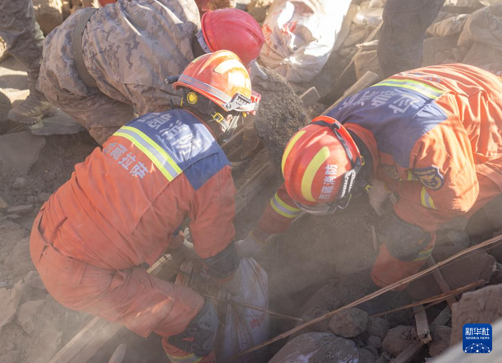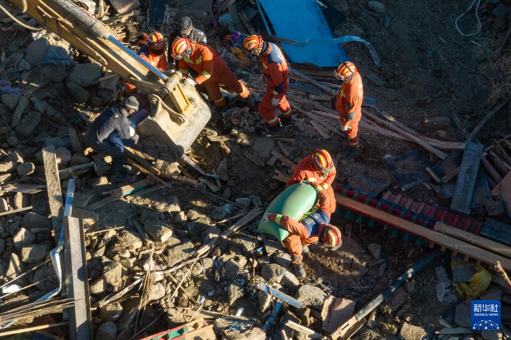 1月13日,在定日縣長所鄉(xiāng)古榮村,消防員、武警官兵和公安干警在搜尋次仁扎西老人家里的青稞。新華社記者 丁增尼達(dá) 攝