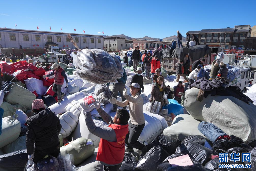 1月10日,在定日縣民族團(tuán)結(jié)廣場(chǎng),人們搬運(yùn)將要運(yùn)往受災(zāi)群眾安置點(diǎn)的過(guò)冬物資。新華社記者 沈伯韓 攝