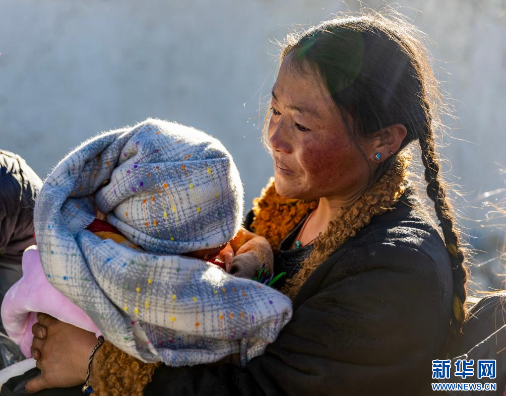 1月8日,定日縣長(zhǎng)所鄉(xiāng)通來(lái)村的受災(zāi)群眾措姆抱著自己的孩子在領(lǐng)取志愿者送來(lái)的御寒衣物。新華社記者 姜帆 攝