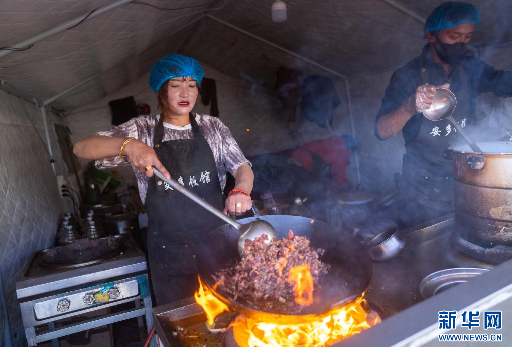 在定日縣長(zhǎng)所鄉(xiāng)古榮村,定日縣安多飯館的吉瓊在為安置點(diǎn)的群眾做晚飯(1月15日攝)。新華社記者 丁增尼達(dá) 攝