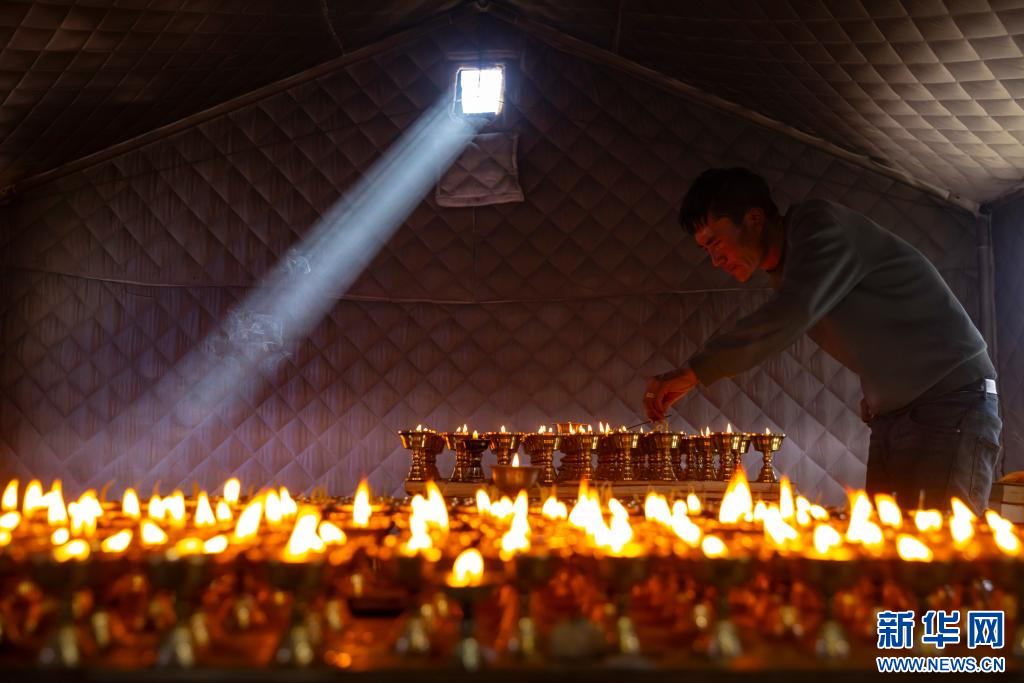 1月12日,在定日縣長(zhǎng)所鄉(xiāng)古榮村,一名受災(zāi)村民為在定日縣6.8級(jí)地震中逝世的親人點(diǎn)長(zhǎng)明燈祈福。新華社記者 沈伯韓 攝