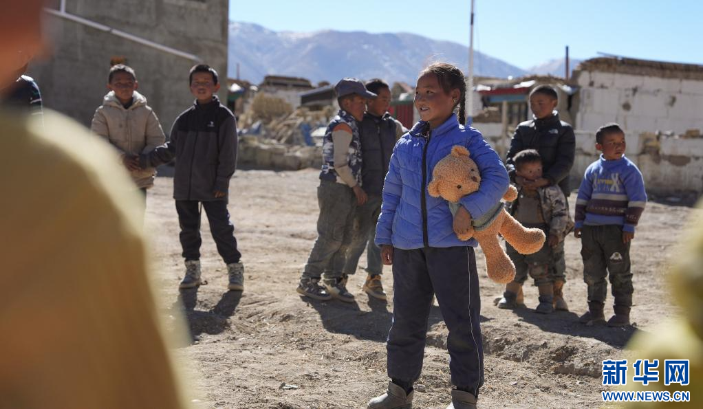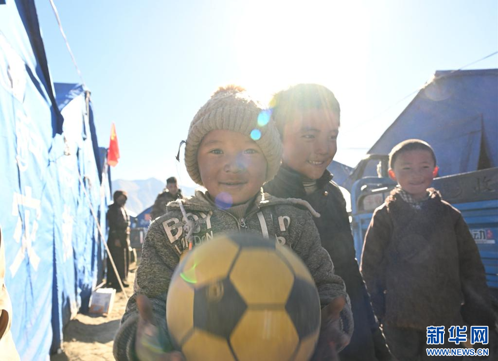 1月11日,薩迦縣麻布加鄉(xiāng)普村安置點(diǎn)的小朋友在玩球。新華社記者 李響 攝
