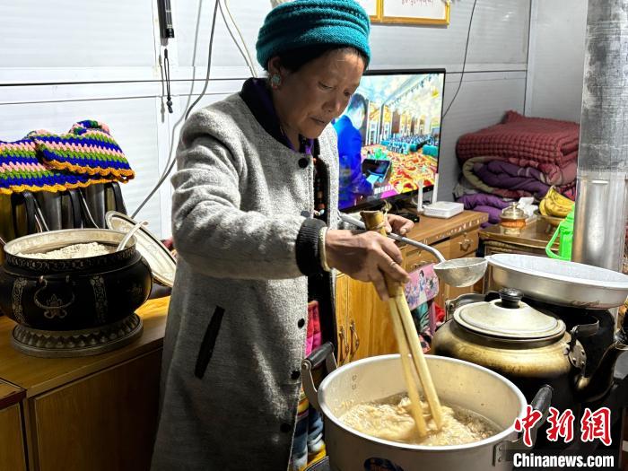 圖為日喀則市拉孜縣錫欽鄉(xiāng)錫欽村安置板房?jī)?nèi),村民瓊拉在煮大年初一的“羌鍋”。何金龍 攝