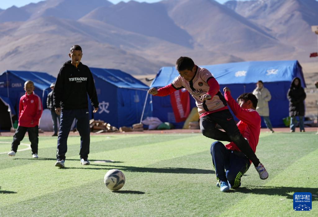 1月25日,在定日縣曲洛鄉(xiāng)熱木青村安置點,大學(xué)生志愿者在安置點和孩子們一起玩游戲。新華社記者 晉美多吉 攝