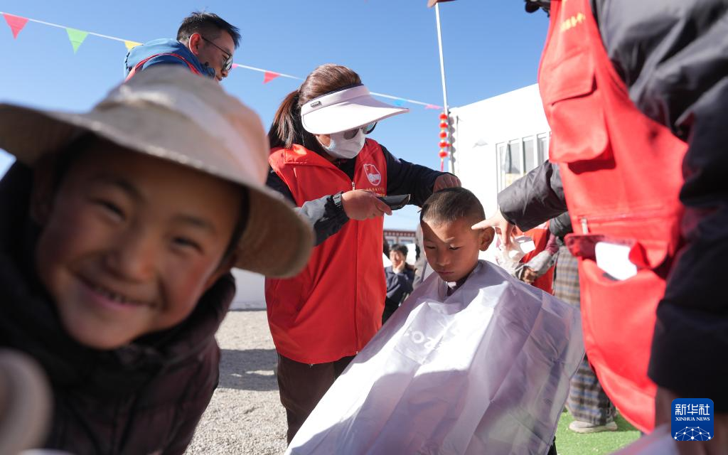 1月26日,志愿者在拉孜縣吉如村安置點給孩子們理發(fā)。新華社記者 晉美多吉 攝